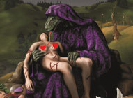 So viel Ehrerbietung wird unserer Justine nicht vergönnt. An Stelle der trauernden Maria schändet ein echsenhaftes Ungeheuer ihren Leichnam, das mit seiner schleimigen Zunge lüstern ihre Brüste beleckt.