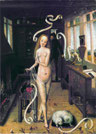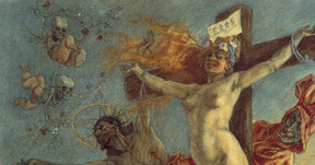 Auch seine "Versuchung des heiligen Antonius" stellt eine gekreuzigte Frau dar, mit allerdings völlig anderer Bedeutung als unsere Justine, denn sie ist kein leidendes Opfer, sondern die personifizierte Wolllust, die den heiligen Antonius verführen will.